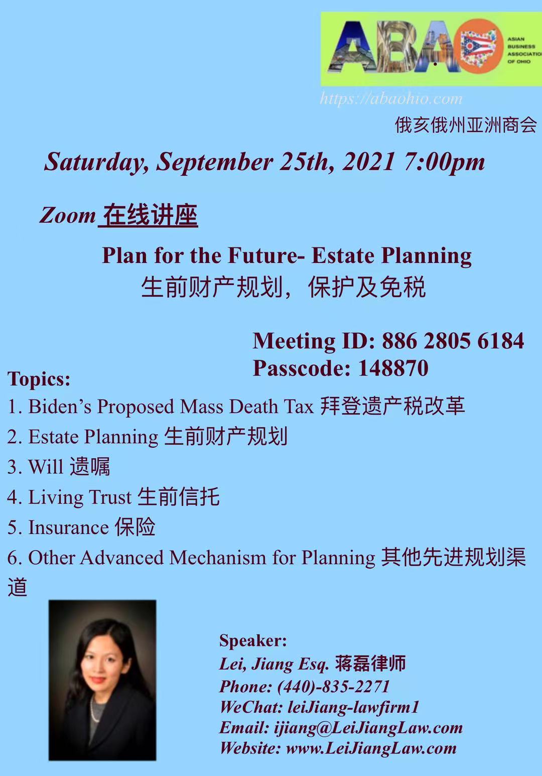 On July 22nd, ABAO hosted a seminar on "Plan for the Future - Estate Planning", presented by Lei Jiang, ESQ.